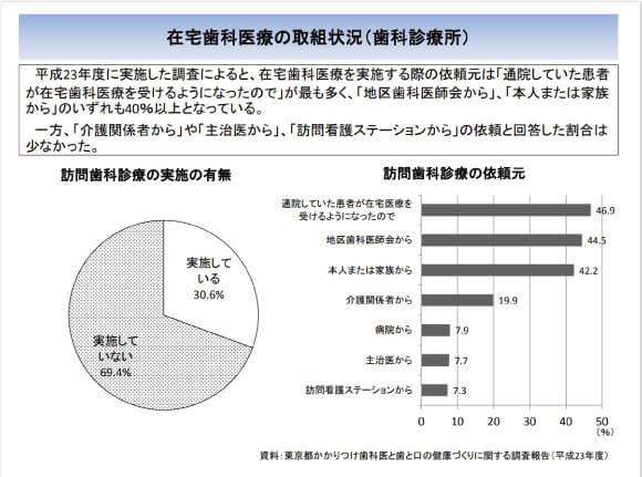 上記の調べを見てみると、在宅歯科診療を実施している歯科医は30.6%という数字になっています。ニーズはあるものの、なかなか訪問するまでの取り組みが追いついていない状況であることが伺えます。