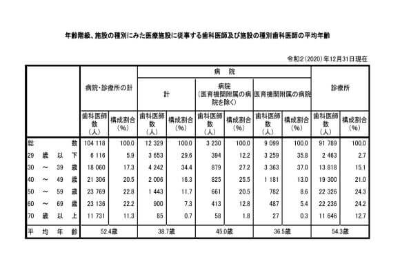先ずここで医院(医療施設)または診療所(開業医含)に従事する歯科医師の人数及び平均年齢別にまとめた割合をみてみます。