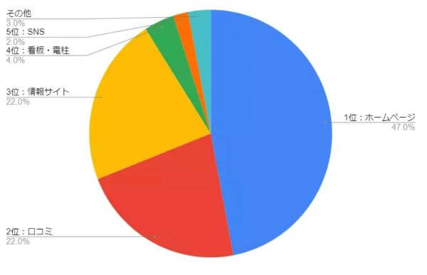 来院のきっかけとなることで最も多かったのが「ホームページを見て」47%、次いで「口コミ」「情報サイト