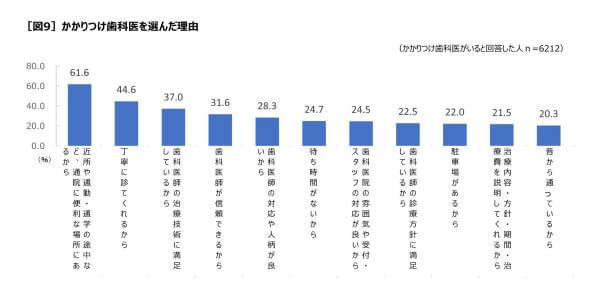 かかりつけの歯医者があると答えた人のなかで、その理由として「通院に便利な場所」(61.6%)が最も多く、次いで「丁寧に診てくれる